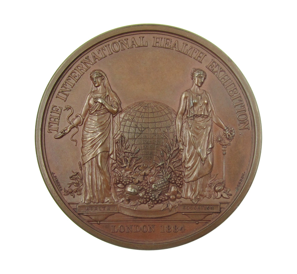 A globe bearing fruits of the world. Struck for the International Health Exhibition of London, 1884.