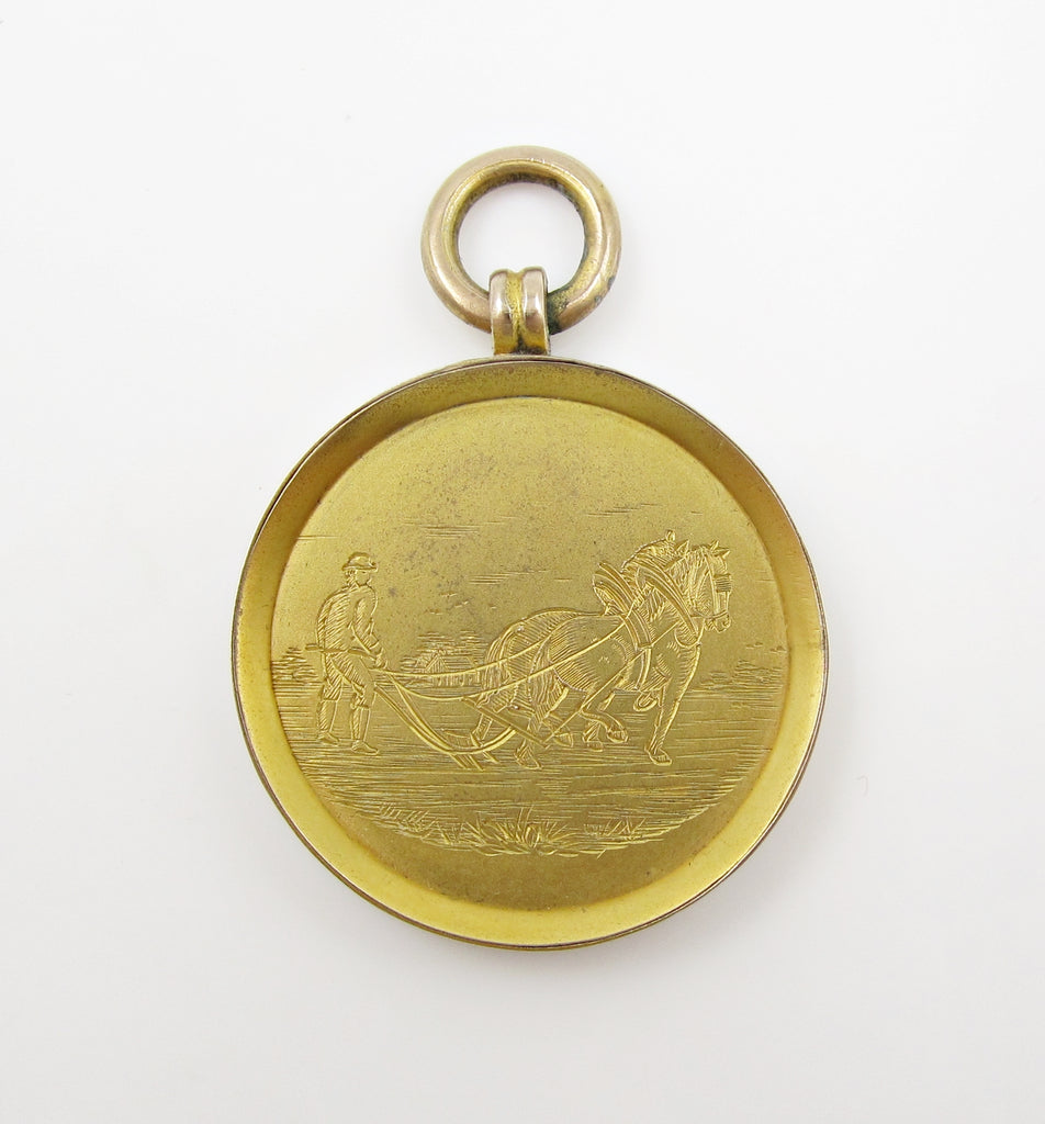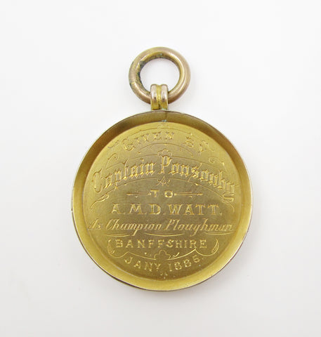 Obverse with ploughing scene, reverse engraved with 'Given By - Captain Ponsonby - To - A.M.D Watt - As Champion Ploughman - Banffshire - Jany1886'.