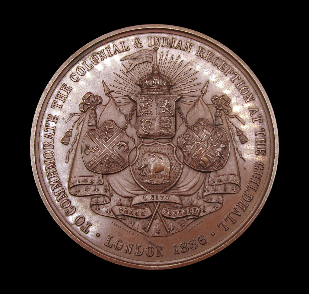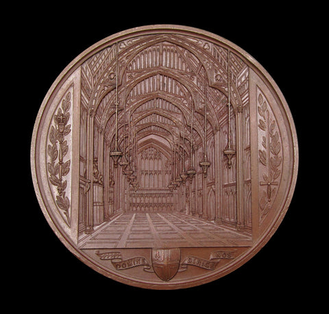 Obverse with a decorated mantle, reverse with a detailed interior view of the Guildhall.