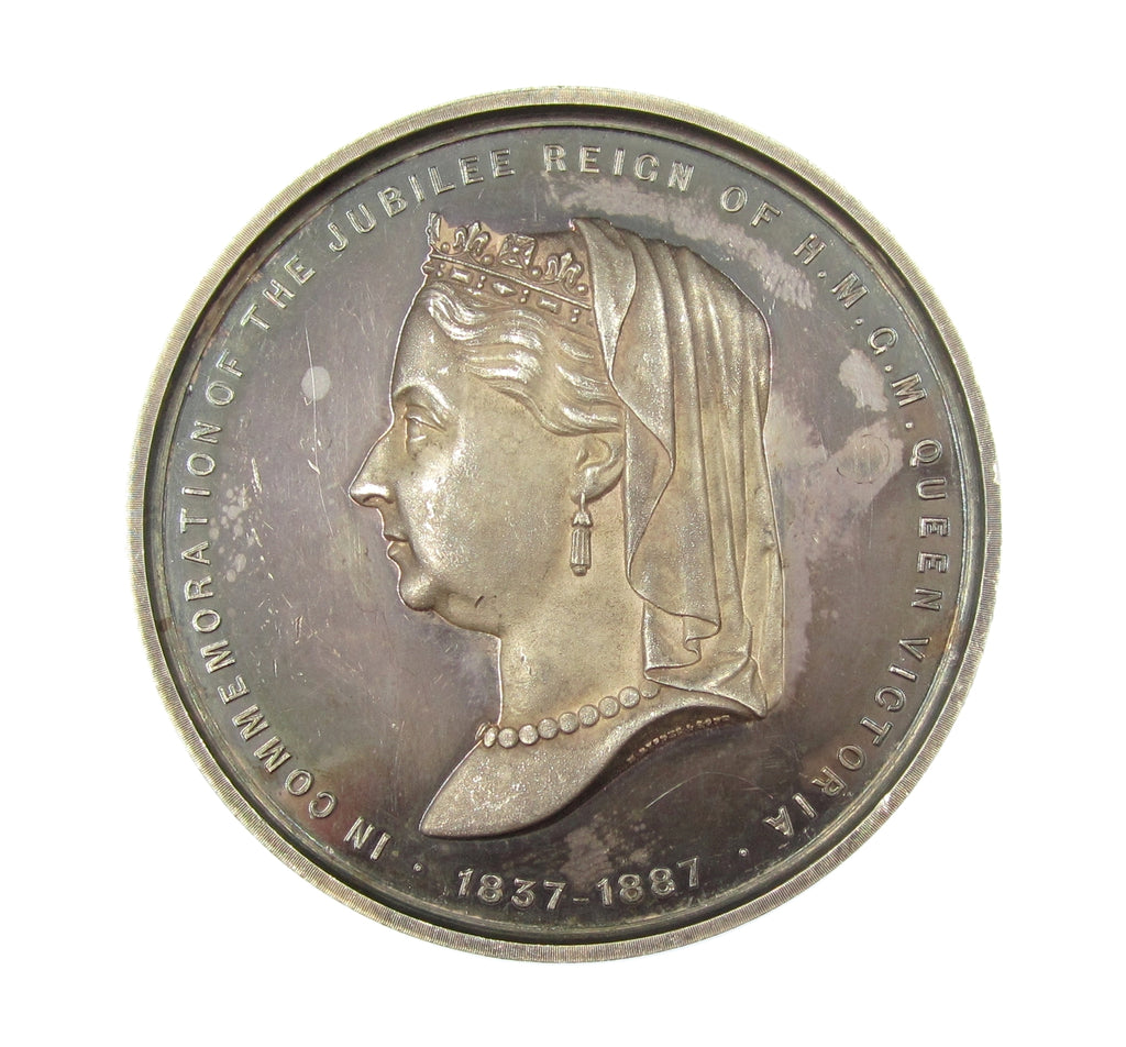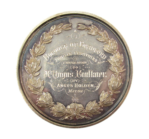 Obverse with veiled bust of Victoria, reverse with wreath enclosing engraved inscription 'Borough of Bradford Jubilee Festivities, Presented to Mr Angus Faulkner by Angus Holden, Mayor'.