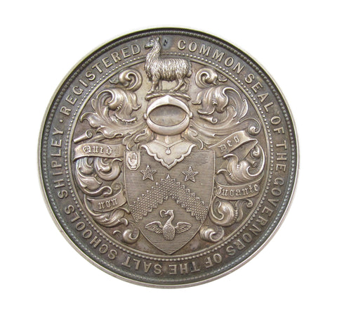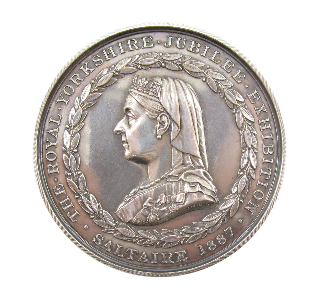 Obverse with veiled and diademed bust of Victoria, reverse with coat of arms and legend around. Edge engraved '2nd Class Award To Messrs Jarmain & Son For Wool Waste Carbonised'.