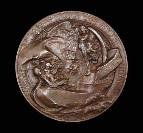 Obverse with elaborate crowned bust to right, reverse with a winged figure, representing Art, standing on the stern-castle of the Ship of State within legend 'ART SAILETH THOUGH LIFE FAILETH'.