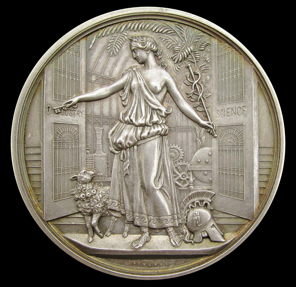 Obverse with Britannia holding caduceus and key, opening the doors to the exhibition, lamb and helmet at her feet, reverse named within wreath; 'Awarded To Emma Davie, For Water Colour Painting - E.A Goodall R.W.S Master - Twenty-ninth Session July 27th 1889'.