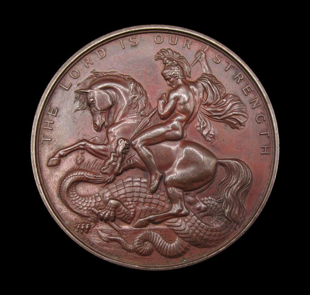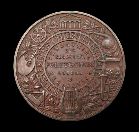 Obverse showing St George slaying dragon (after W.Wyon and in the style of the 1845 Prince Albert medal). Reverse with 'YOUNG MENS’ CHRISTIAN INSTITUTE', within border of emblems of the arts, sciences and industry. Edge inscribed 'C.P Rogers. Building Construction. 1889'.