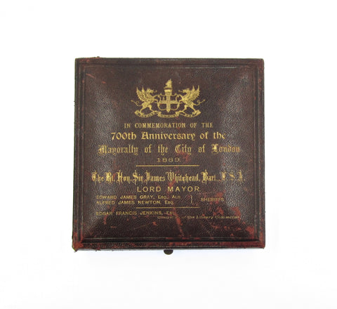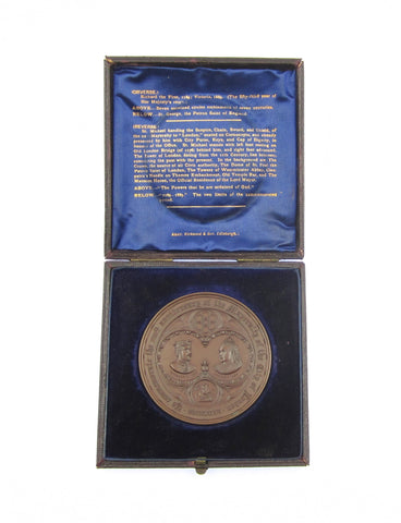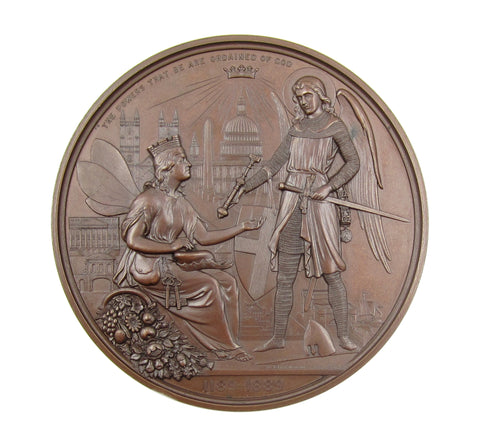 Issued on behalf of the Corporation of the City of London. Obverse with Victoria and Richard I crowned and draped busts facing towards each other and St George and Dragon below. Reverse showing Londinia seated right, receiving symbols of Mayoralty from St Michael.