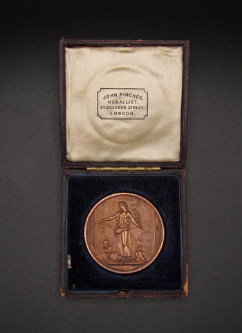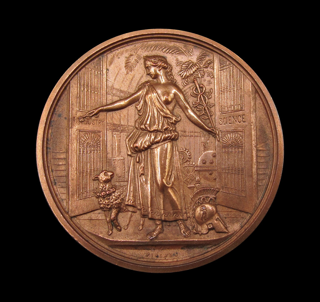 Obverse with Britannia holding caduceus and key, opening the doors to the exhibition, lamb and helmet at her feet, reverse with legend above wreath. Edge engraved 'T.J Bright, Class A A. Sec. 5.'