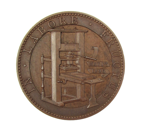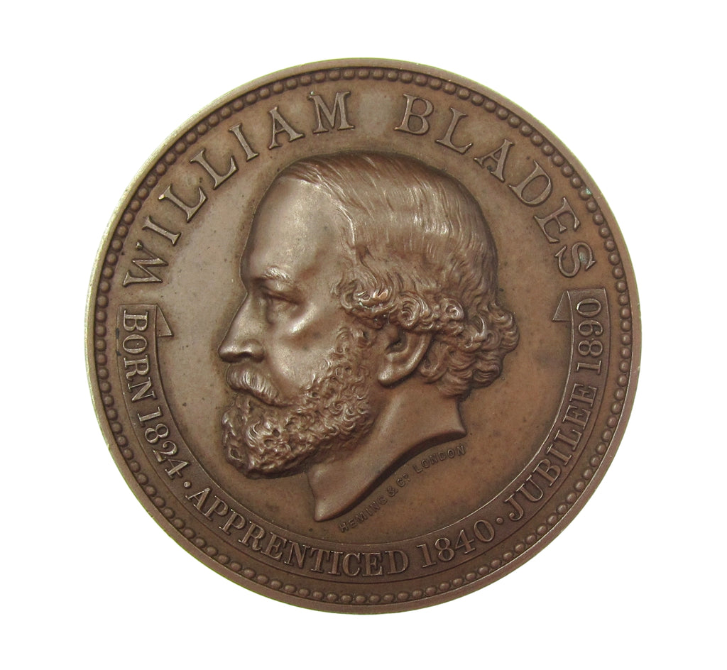 Obverse with bare head of William Blades, reverse with an early printing machine.