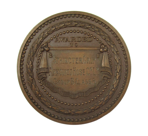 Obverse with two supporters holding flowers above tablet, reverse named to 'Sphincter Grip Armoured Hose Co Ld, Group B, Class6'.