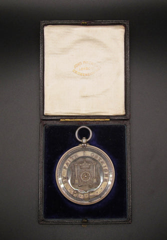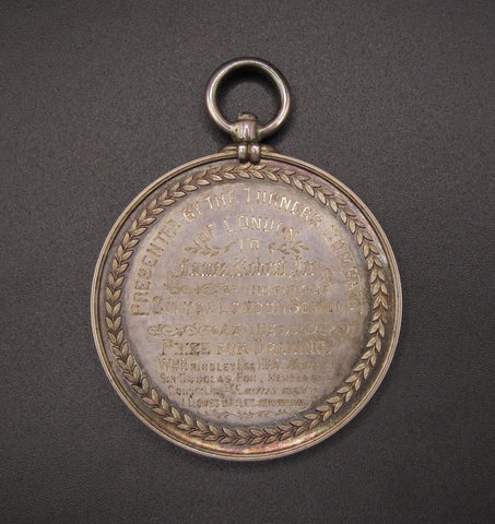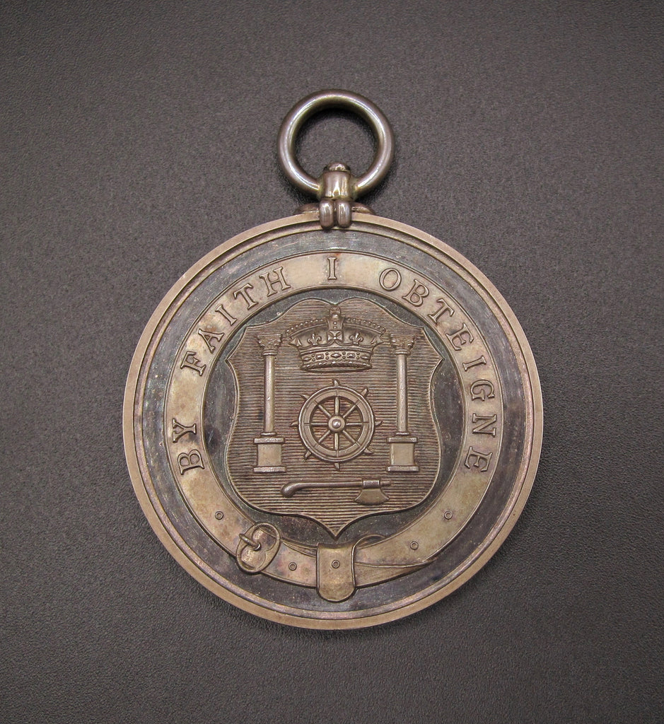Obverse with coat of arms of the Turner's Company, in very high relief. Reverse inscribed with details of the winner (James Robert Jee) and the associated members of the Company.