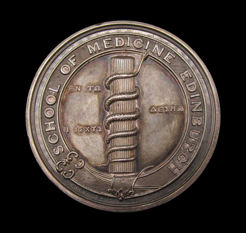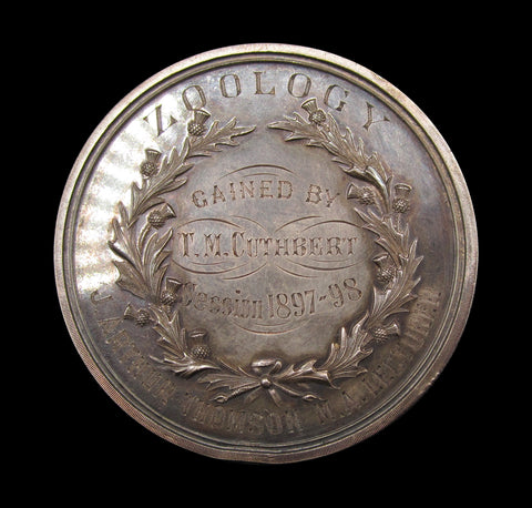 Obverse with serpent coiled around pillar, garter around, reverse engraved 'Zoology - Gained By T.M Cuthbert - Session 1897-98 - J. Arthur Thomson M.A. Lecturer'.