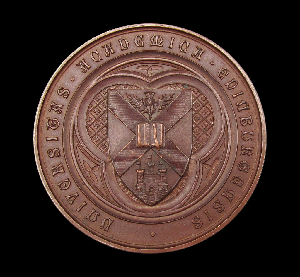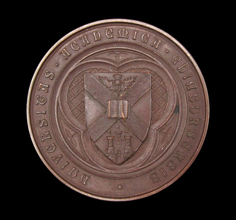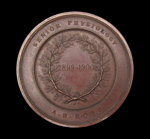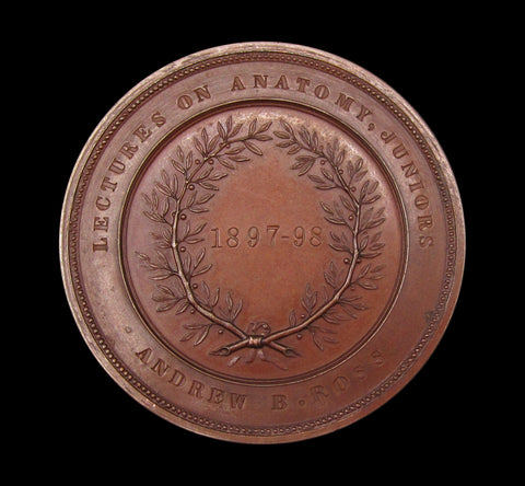 Obverse with coat of arms within legend, reverse with date in wreath and engraved on outer border. Both medals awarded to Andrew B. Ross, one for Lectures on Anatomy, the other for Senior Physiology.