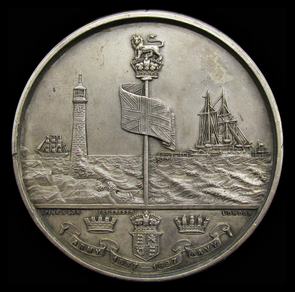 Reverse showing the Union Jack flag by Eddystone lighthouse. Obverse with veiled head bust of Queen Victoria.