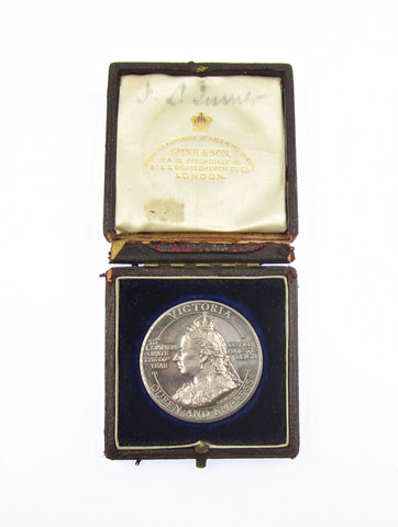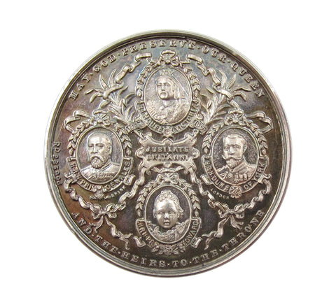 Obverse showing bust of Victoria, reverse with four medallions entwined with ribbons on which are portraits of Queen Victoria, the Prince of Wales, the Duke of York and Prince Edward.