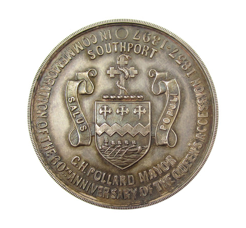 Obverse with veiled bust of Victoria, reverse with coat of arms of Southport within banners and legend around.