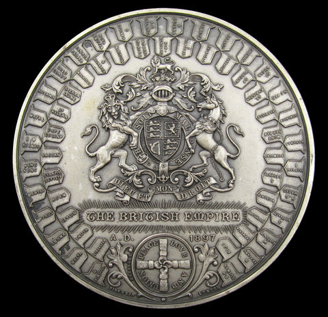 Reverse border with fifty shields of Colonies and Protectorates, all identified.