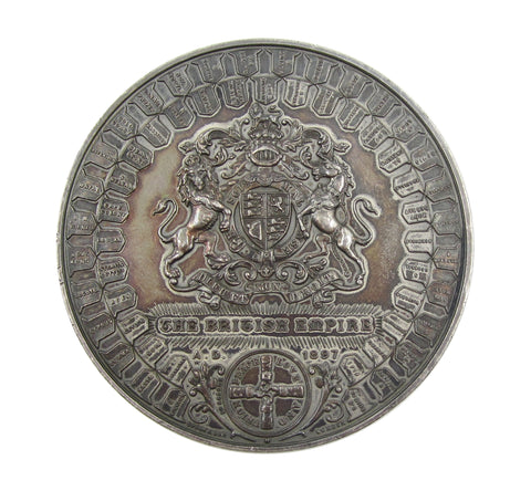 Reverse border with fifty shields of Colonies and Protectorates, all identified.
