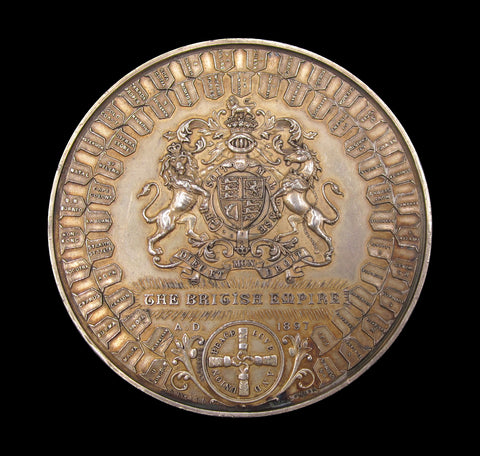 Reverse border with fifty shields of Colonies and Protectorates, all identified.