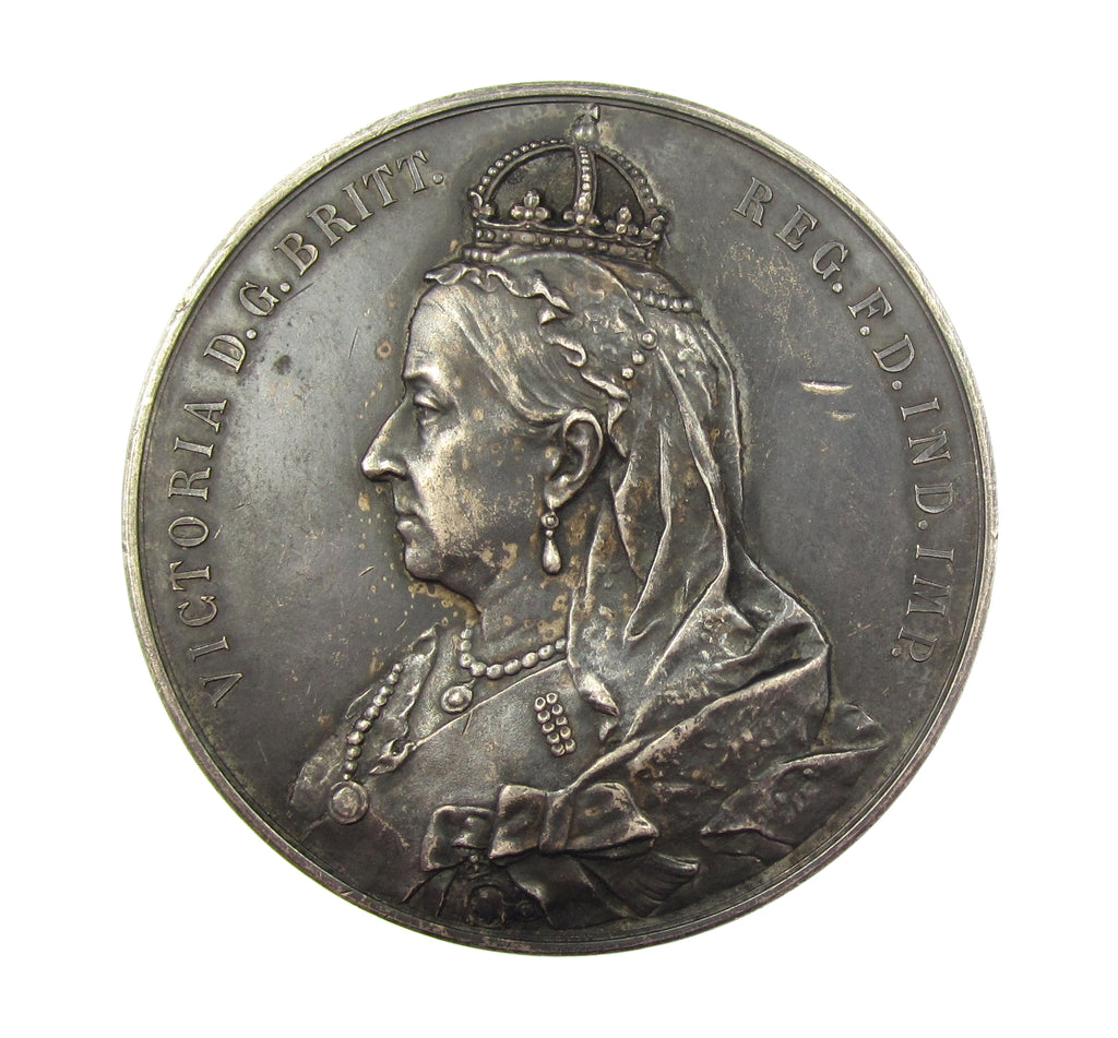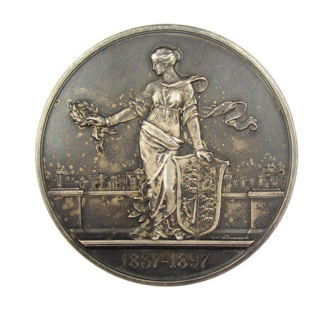 Obverse with crowned, veiled and draped bust of Victoria, reverse with a female standing on terrace with view of Windsor Castle in the distance.
