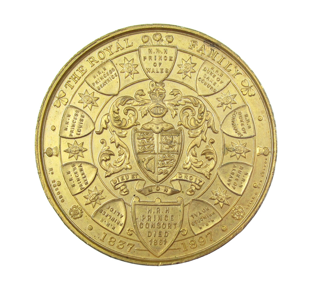 Obverse showing bust of Victoria, reverse with royal coat of arms within circle of shields containing names of the members of the Royal Family.