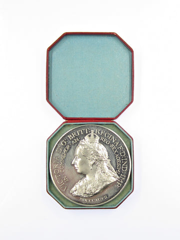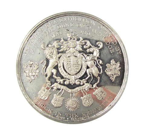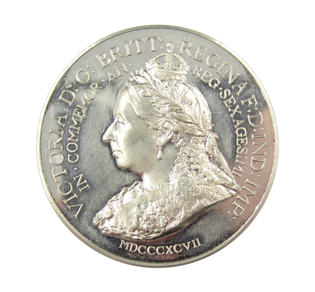 Obverse showing bust of Victoria, reverse with coat of arms and various insignia below.