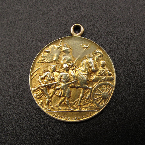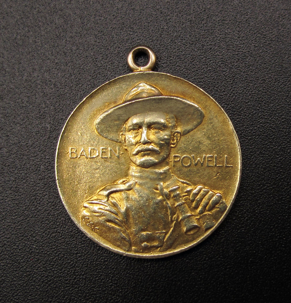 Obverse with uniformed bust of Lord Baden-Powell, reverse showing three British soldiers of the armed services advancing, greeted by a solider waving his hat.