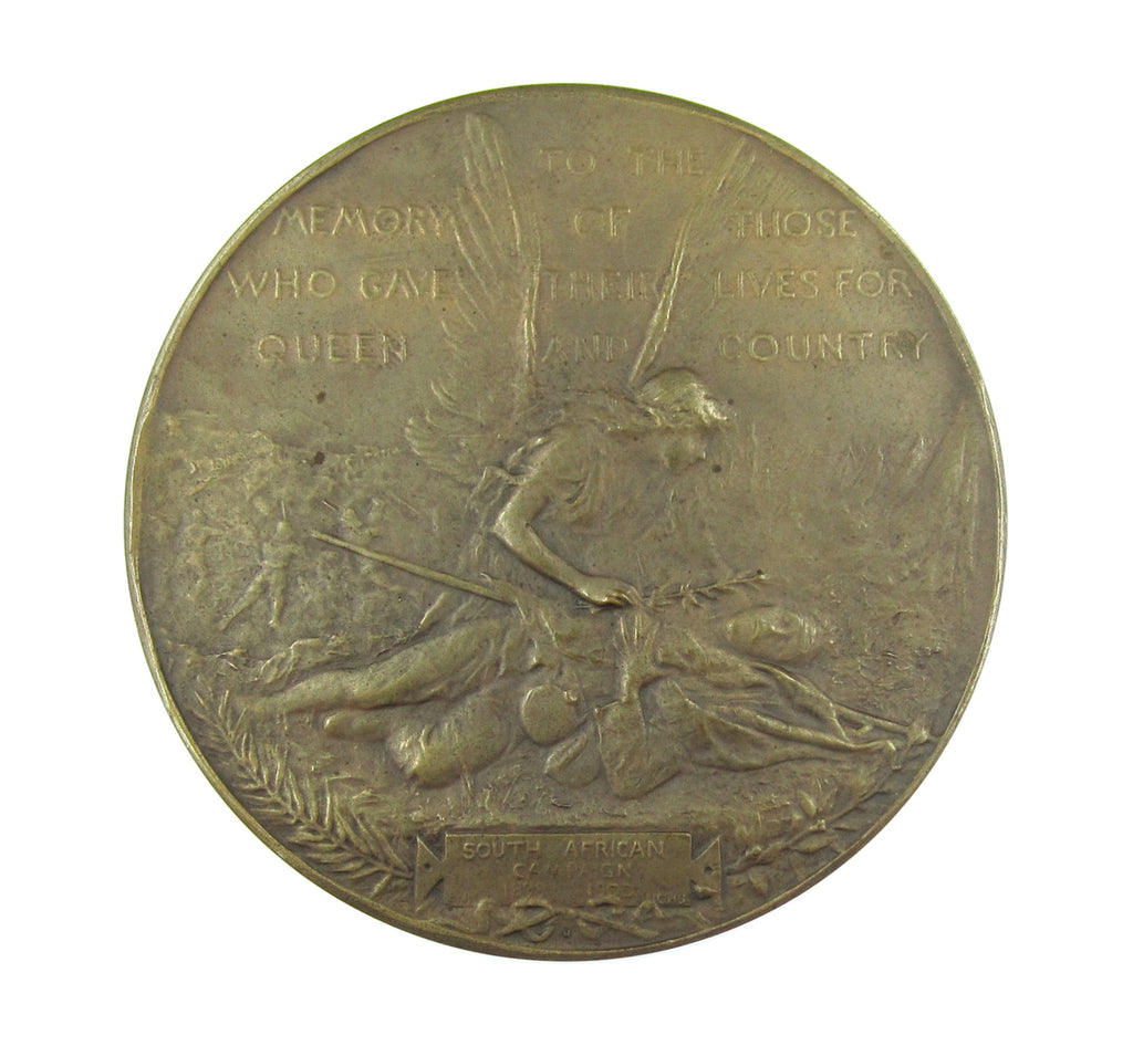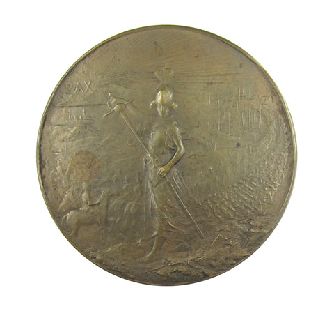 Obverse with an Angel with olive branch kneeling over a fallen soldier clutching a flag. Reverse shows a helmeted figure of Bellona standing on a rocky ledge.