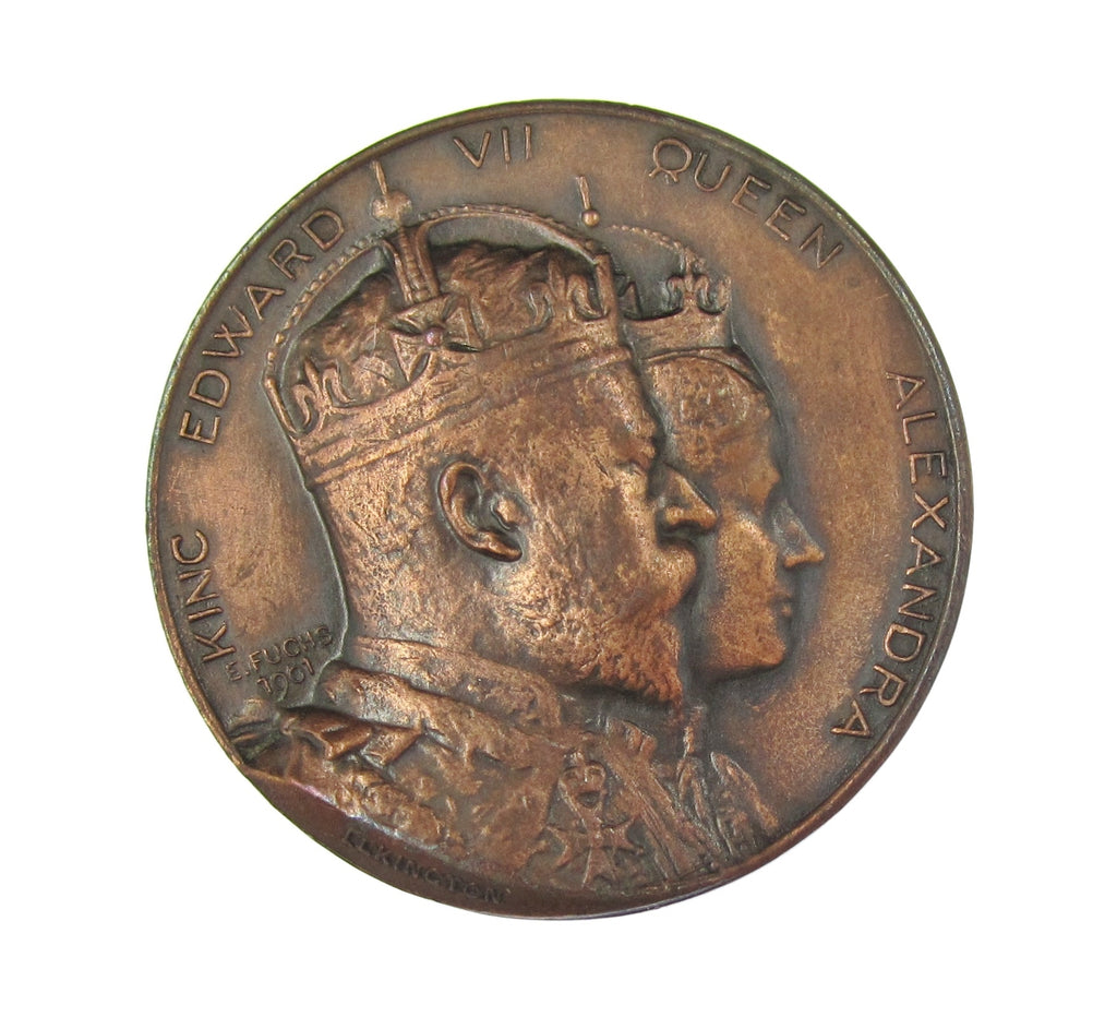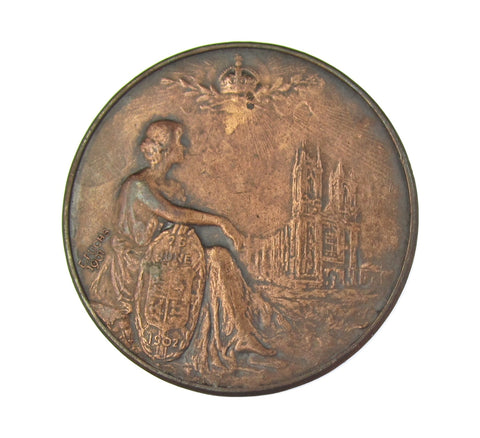 Female figure seated displaying an oval shield inscribed '26 June 1902'.