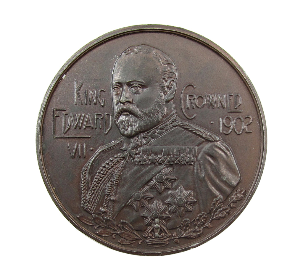 Obverse with uniformed bust of Edward VII, reverse with royal arms of supporters.