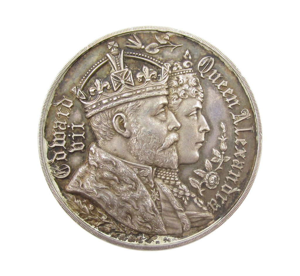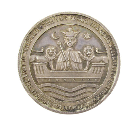 Obverse with conjoined busts of Edward VII & Queen Alexandra, reverse with the king seated in ship flanked by lions, crescent moon and star above.