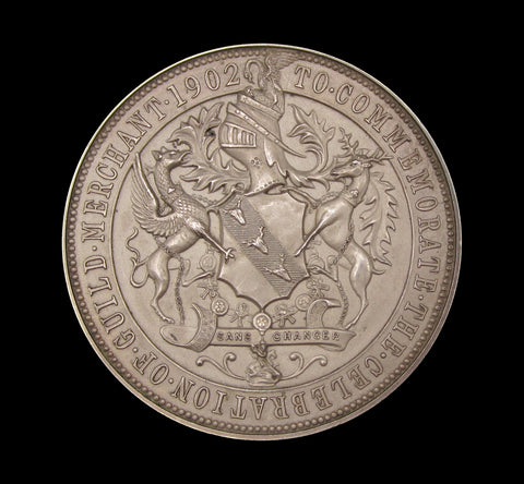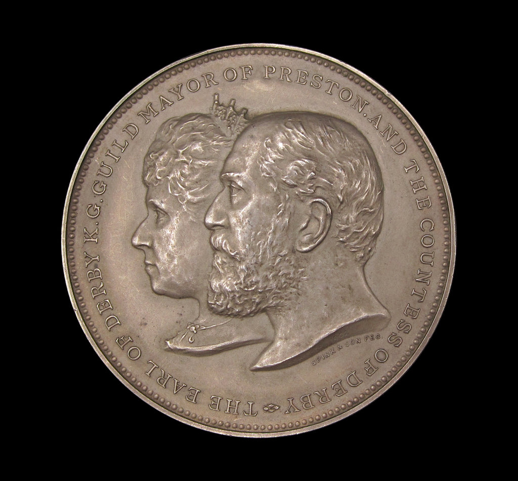 Obverse with conjoined busts of the Earl and Countess of Derby, reverse showing arms of the Guild. Edge stamped silver.