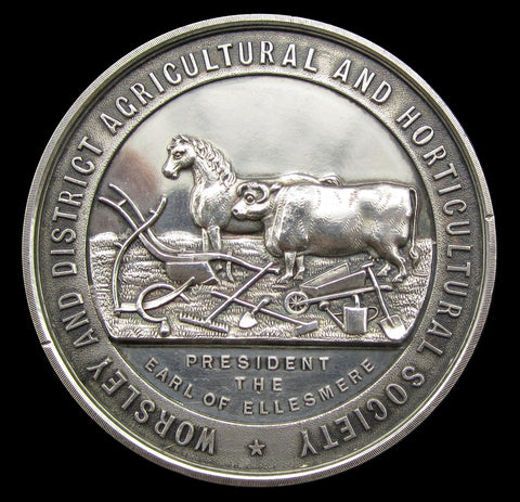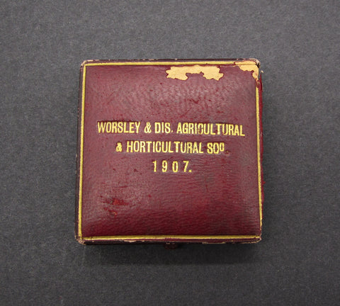 1 x 1907 Hallmarked 44mm silver medal for Worsley and District Agricultural and Horticultural Society, awarded for Horse Shoes. Brightly cleaned and housed in damaged, fitted case of issue.