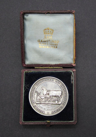 2 x 1906 Altrincham Agricultural Society silver medals awarded for the best set of both light and heavy horseshoes. Both 49mm in diameter and encased in glass lunettes. Both cased, although one with lid detached.
