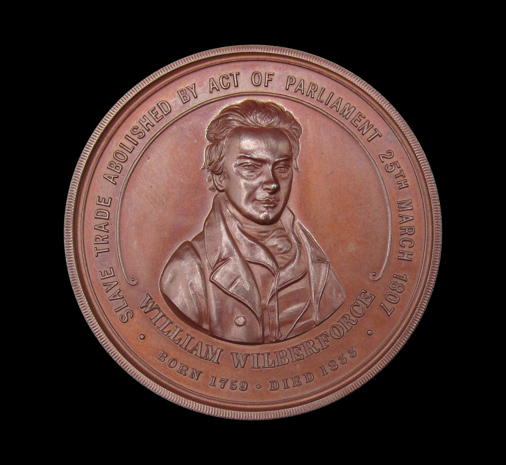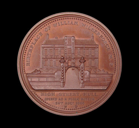 Obverse with draped bust of William Wilberforce, reverse with facade of the house which was the birthplace of Wilberforce.
