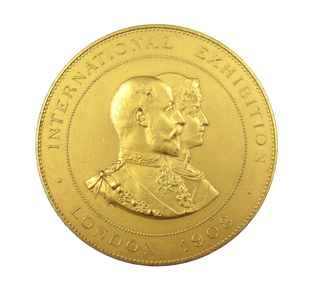 Obverse with conjoined busts of Edward VII & Alexandra within beaded circle, reverse with view of exhibition building and gardens.