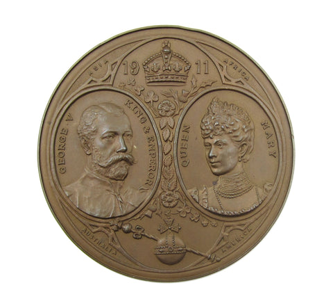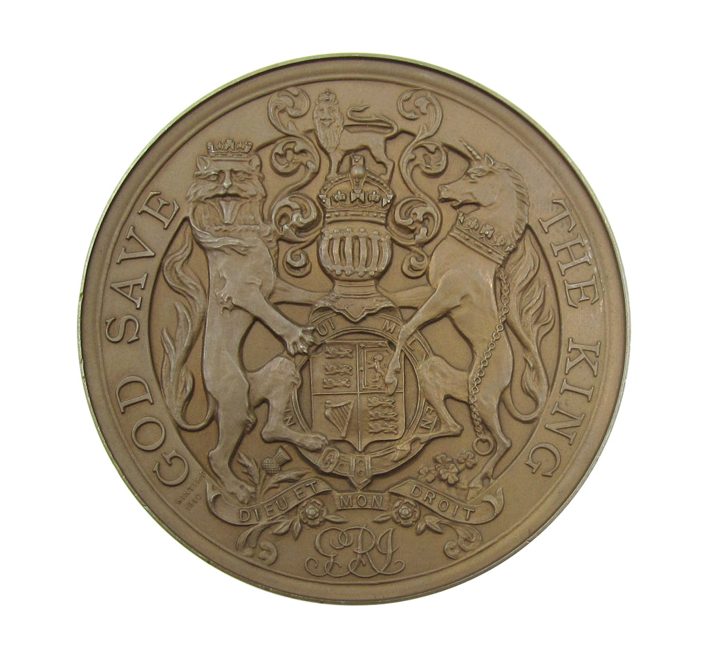 Obverse with crown above inward facing medallic busts, reverse with Royal arms within legend.