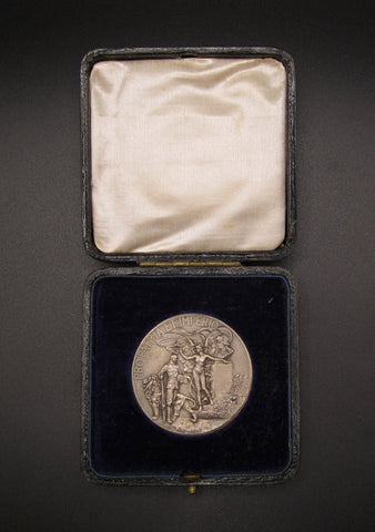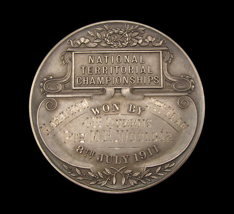Obverse with British soldier standing alongside lion, reverse engraved 'Marathon - 2nd Team - 4th Queens - Pte M.E. Woolgar'.