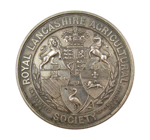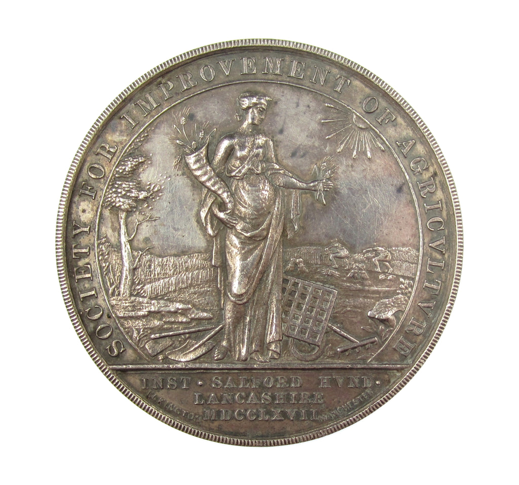 Obverse with Ceres with open wreath of corn and worker in field beyond, reverse with Royal, County and City Arms. Edge engraved 'Awarded To Chas A Young. For Carnations. Liverpool Show. 1914'.