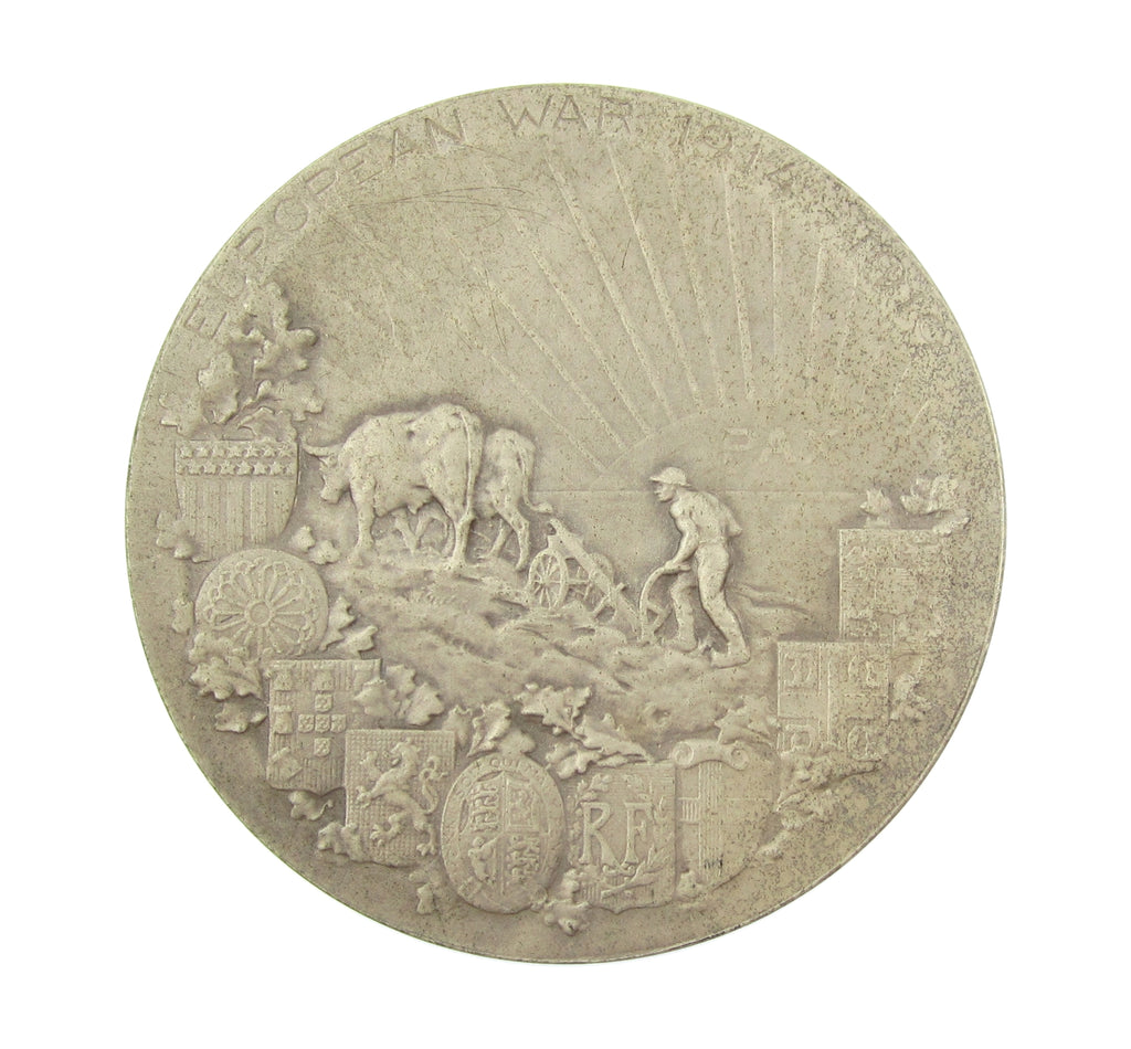 Obverse with farmer ploughing field with two oxen, reverse with peace standing before and array of standards.