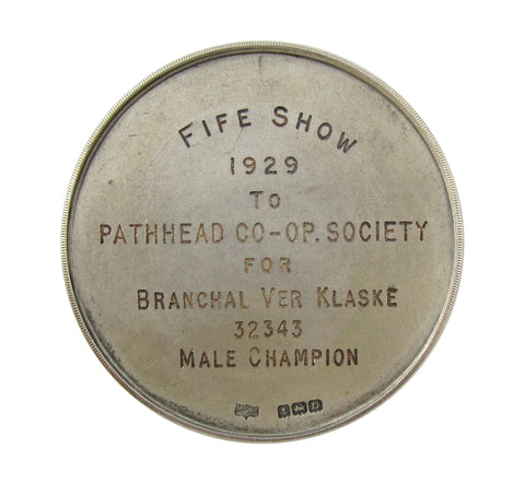 Obverse with 5 line legend within wreath, reverse engraved 'Fife Show 1929 to Pathhead Co-op Society, For Branchal Ver Klaske 32343 Male Champion'.