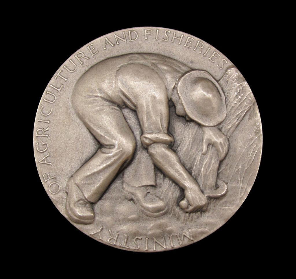 Obverse with view of farmer cutting wheat, reverse with legend and wheat around a map of the UK. Edge engraved 'Exors. Of Walter Green. Castle Flour Mills. Beccles.'