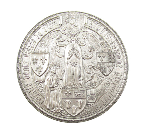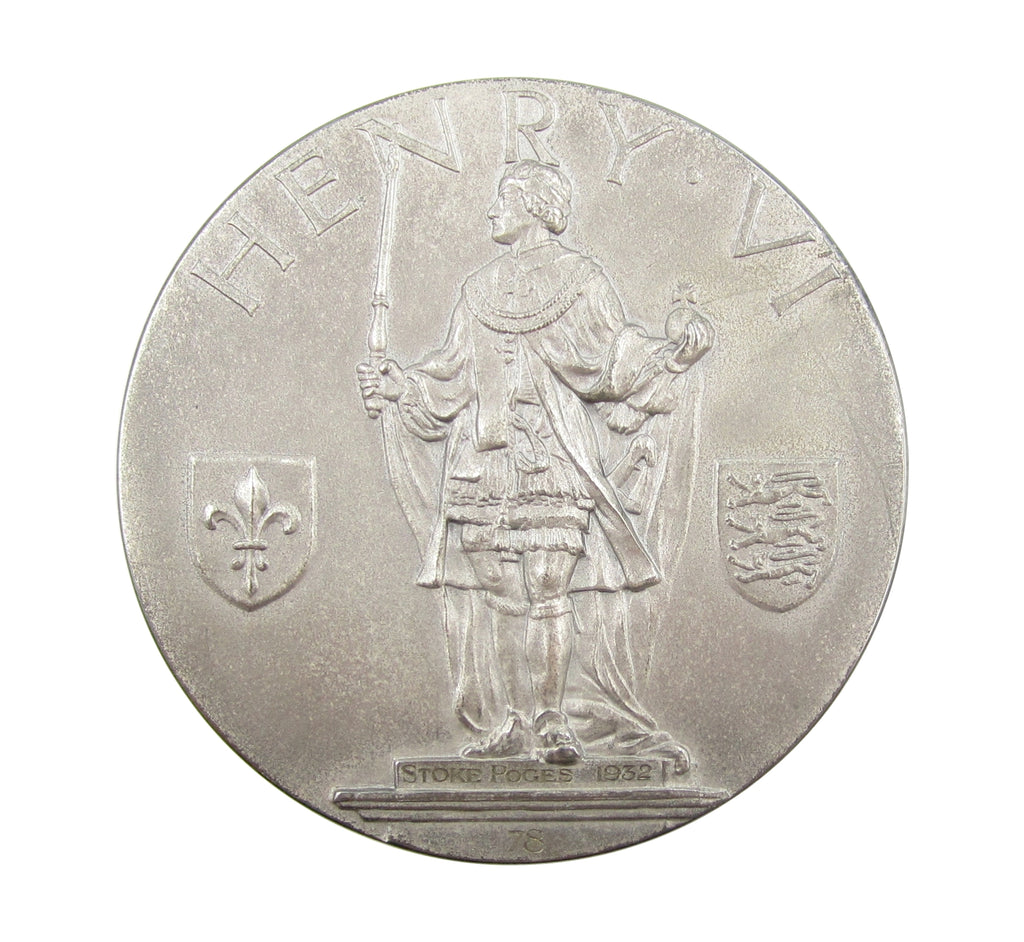 Obverse with statue of Henry VI dividing two shields of arms, reverse with representation of the coronation of the Virgin, based on the Eton College seal. Engraved within exergue 'Stoke Poges 1932 - 78'.
