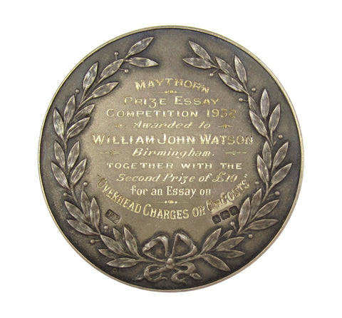 Obverse with initials on cinquefoil, reverse engraved 'Maythorn Prize Essay Competition 1932 - Awarded to William John Watson, Birmingham - Together with the second prize of £10 for an essay on Overhead Charges or Oncosts', hallmarked below.