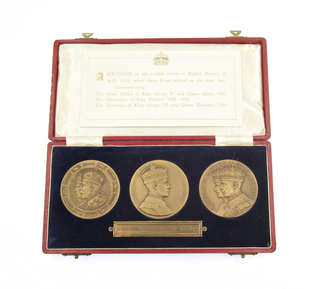 A set of 3 medals depicting King George V, Edward VIII & George VI, celebrating the year 1936 in which all 3 were King at separate points.