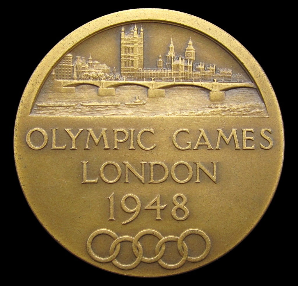 A prototype medal of the 1948 London Olympic medal by Pinches showing a discus thrower with wreath. Reverse showing Parliament and Westminster Bridge and Olympic Rings below.
