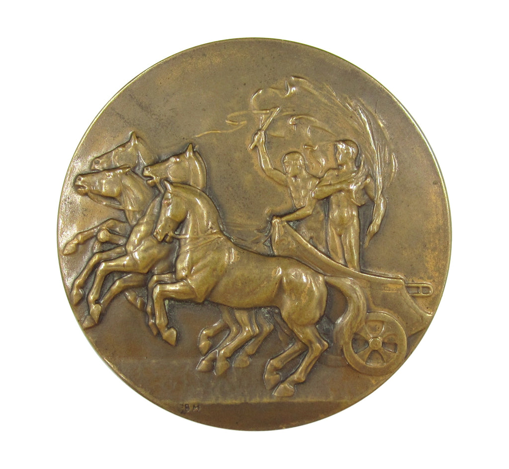 Obverse with view of the Houses of Parliament and Big Ben, Olympic rings below. Reverse with chariot driven by Fame and Victory.