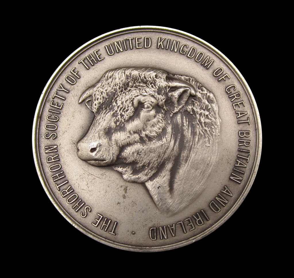 The Shorthorn Society, a silver award medal. Obverse with bulls head, reverse engraved within wreath 'Awarded To Charles Cockroft for Snowdrop 2nd - 97685 (G.R) - "1926" Gold Cup Winner - Southern Area 1951'.
