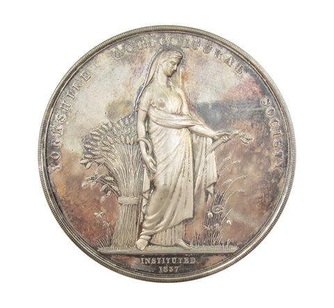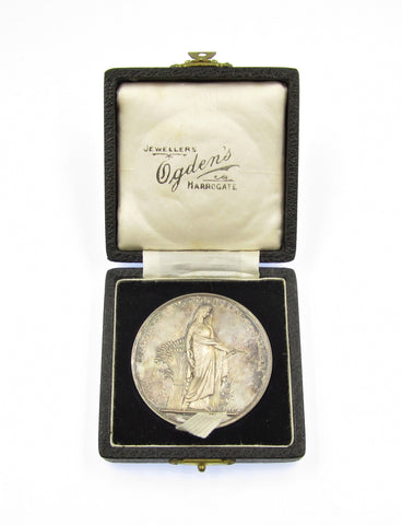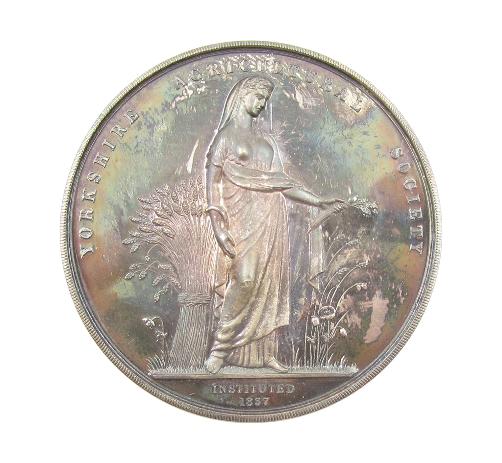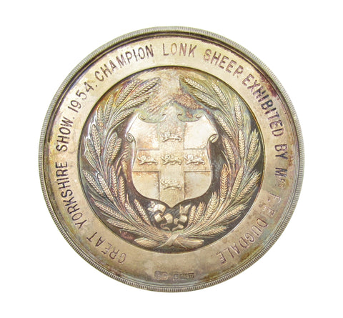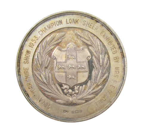 Both medals engraved 'Great Yorkshire Show. Champion Lonk Sheep Exhibited By Mrs F.E Dugdale', one for 1953 and the other for 1954. Hallmarked at bottom of reverse.