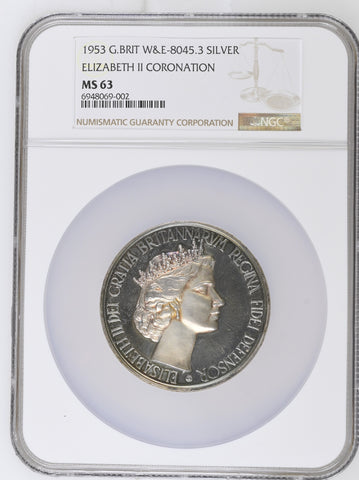 1953 Elizabeth II Coronation 62mm Silver Medal - NGC MS63