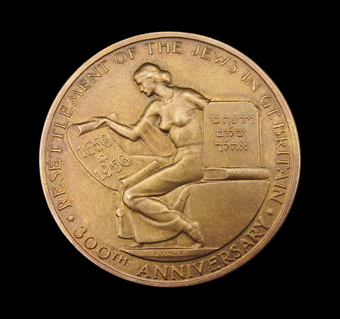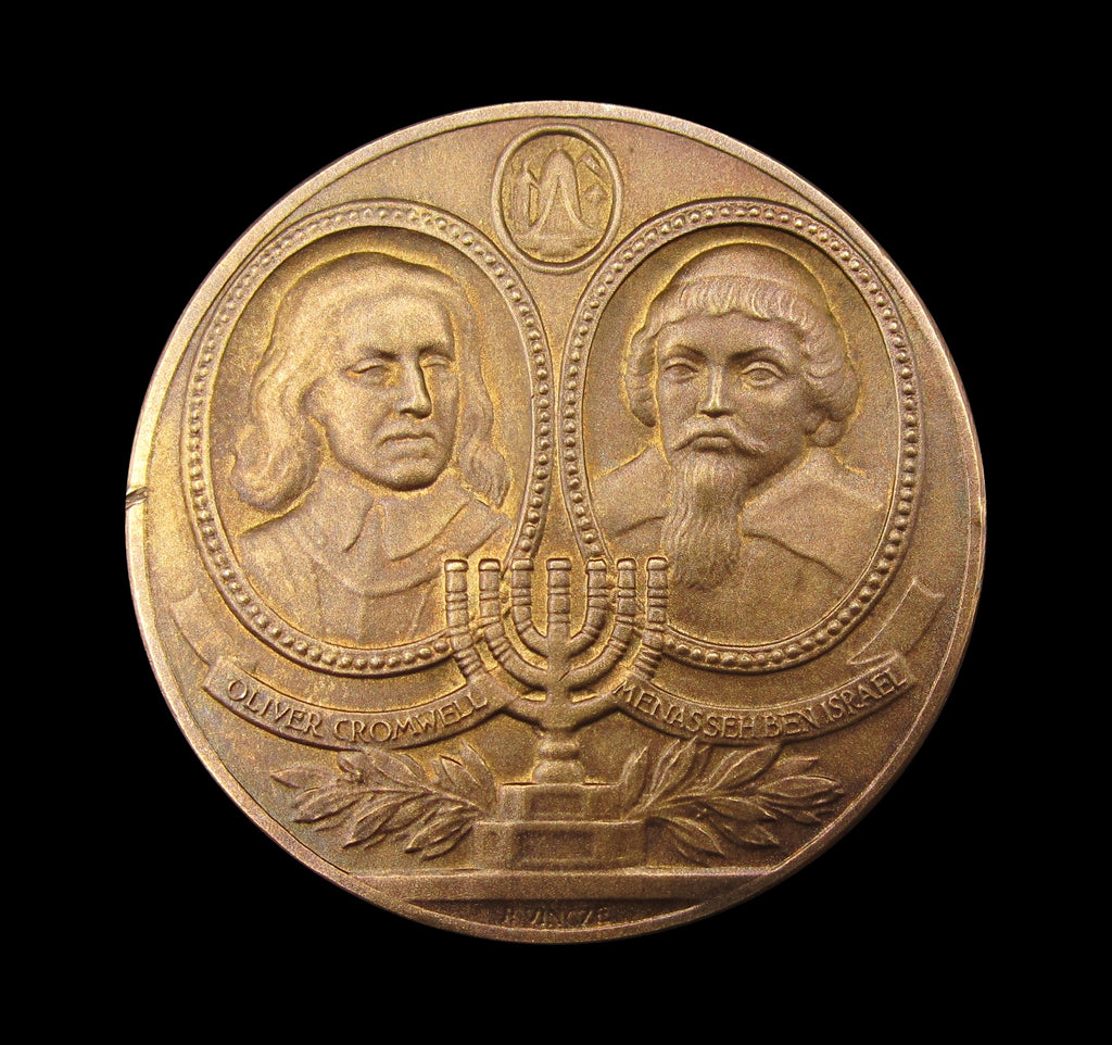 Obverse with busts of Oliver Cromwell and Menasseh Ben Israel within oval frames, reverse with a seated female figure holding a scroll, resting on a table.