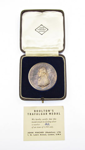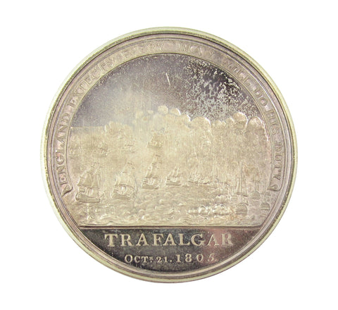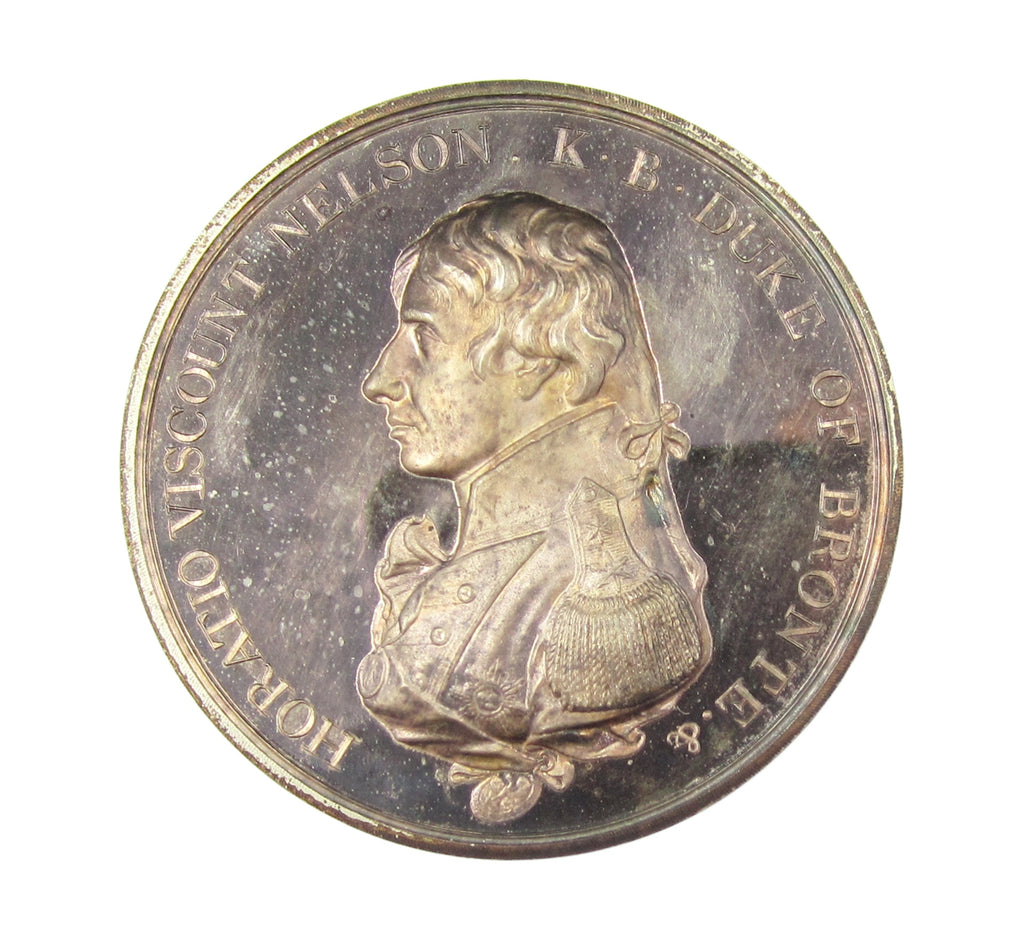Obverse with unifromed bust of Nelson, reverse with panoramic view of naval engagement. Numbered to edge 'No. 22'.